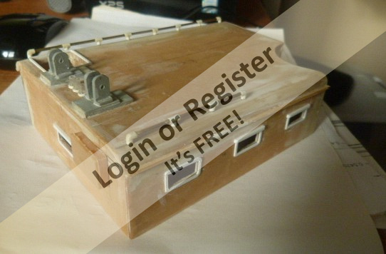 The life raft stowage container (shown) went through a couple of builds because of itโs not so rectangular geometry. The 20mm ammo box was quite simple. One was made for the stern platform and a second at the front where the 20mm gun is located. Most of these details were made from .020 or .030 styrene sheet.