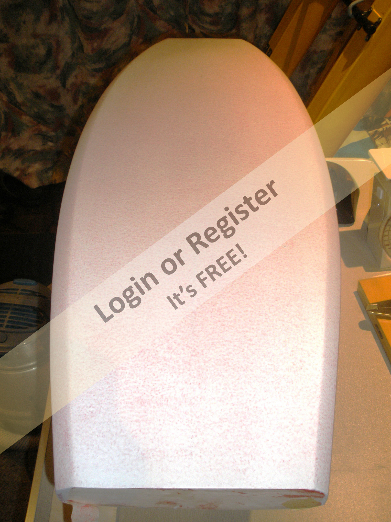 Once I was happy with the shape (checked side to side with cardboard templates) I glassed the hull with epoxy resin and 5 oz cloth. I rolled on a thick layer of resin before the cloth, to help with filling the pores of the foam. Hull had 2 further coats of resin, sanded between coats, then another 2 with fairing powder mixed rolled on, the 2 more thick fairing mixes squeegeed on, (imperfections filled as well). Each coat was sanded back to eventually hide the weave and leave a smooth surface. LOTS of sanding !-orbital sander, finishing sander, block sanding etc and some Surforming of any high spots in the resin.