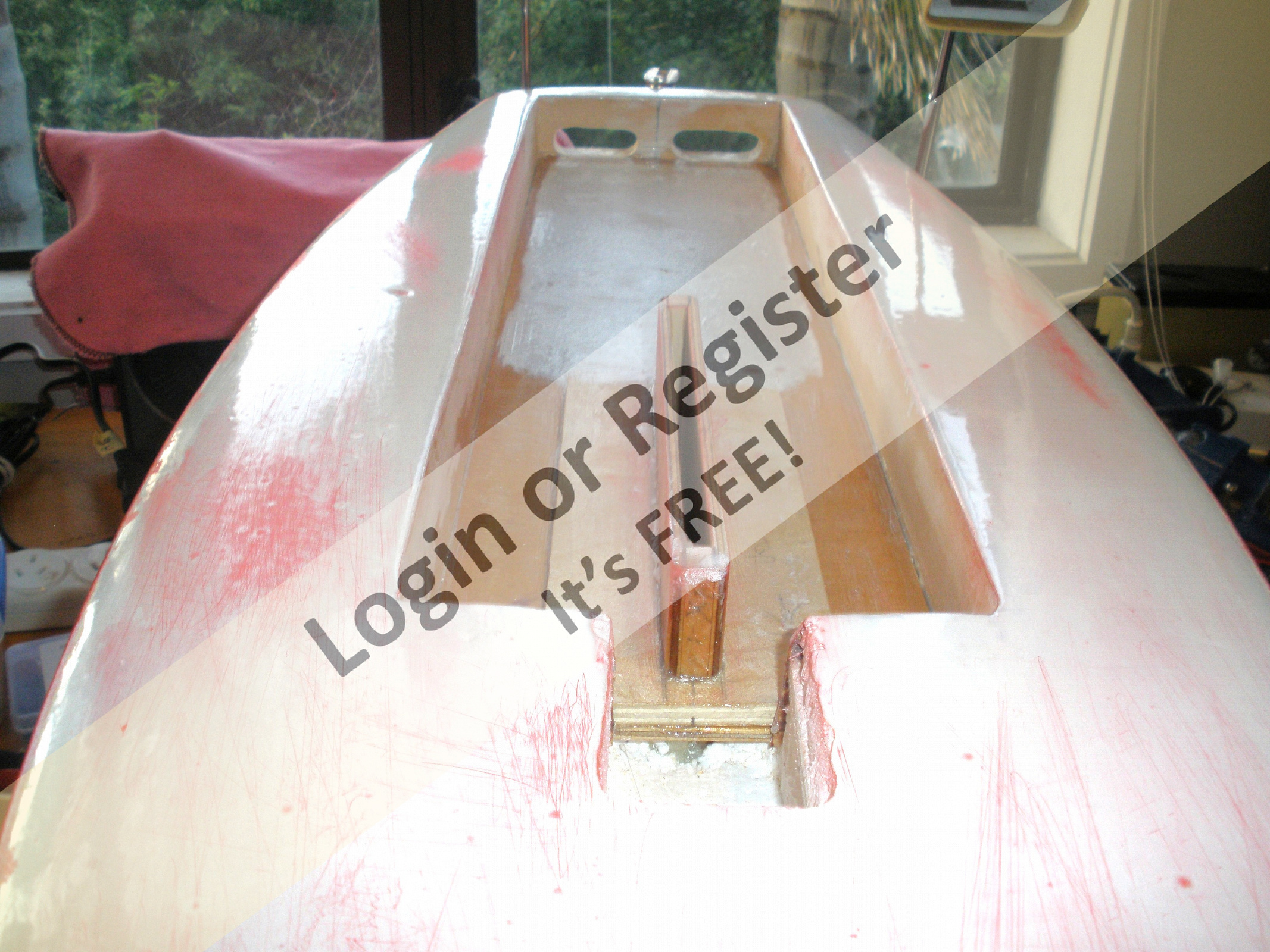 A rebate in the bottom of the hull was routered out for the lower c/board brace. These braces are needed to form part of a box structure with the floor and cockpit sides which the c/board can lever on. Once everything is eventually glassed in, it will make it very strong unit, so the foam will just be the shape surrounding the box, and not having any strain put on it. The ply deck will take the strain of the stays/mast.