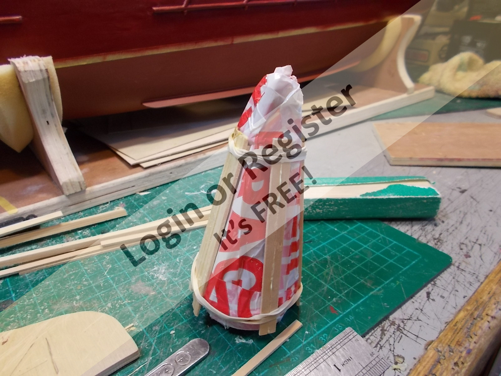 I used a cardboard tube which came from the centre of some knitting yarn which the Mrs is using at the moment. This tube had correct internal dimension required which corresponded with the outside diameter of the Kort nozzle so โ this tube became the former for me to build up laminates of 1 mm thick plywood by 30 mm wide by roughly 200 mm long to begin with. The first laminate I applied some cellotape to one side of it to prevent it bonding to the inside of the cardboard tube.