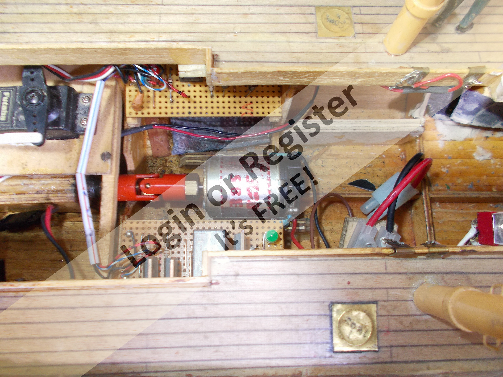 Just to give you some idea of what can be achieved with the internals of the boat, without removing the deck - these models require a small amount of power to push them along at quite a speed. So, in this model that I built there was a 385/400 MFA motor driving a 35mm 4 bladed brass prop. I used (I think it was a 7.2 NiCad battery). Bear in mind this model was built in the 90s - the weird looking circuitry either side of the motor on the strip board is an actual home made speed controller. As you can see, there is a standard servo which I fitted and a miniature receiver. There is also room for a power supply of 4.5 volt for the radio gear.