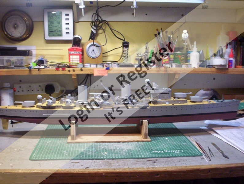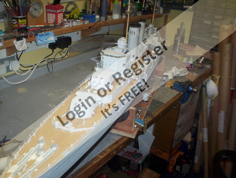 This model was built approx 20 year ago from Norman Ough plans also other various sources were used. It is plank on frame construction with revolving gun turrets and torpedo tubes. She is now really due a refit as she is a bit dusty and worn out - you will see her in her prime - alongside HMS Nelson which was built at 1:96 scale by a friend of mine Brian Chambers. The next 2 pics you can see her in the garage alongside HMS Exeter. She is actually depicted when she came from USA after a major refit when her new secondary armour and upgraded radar were fitted. Note the catapult and spotter plane were removed on that refit.