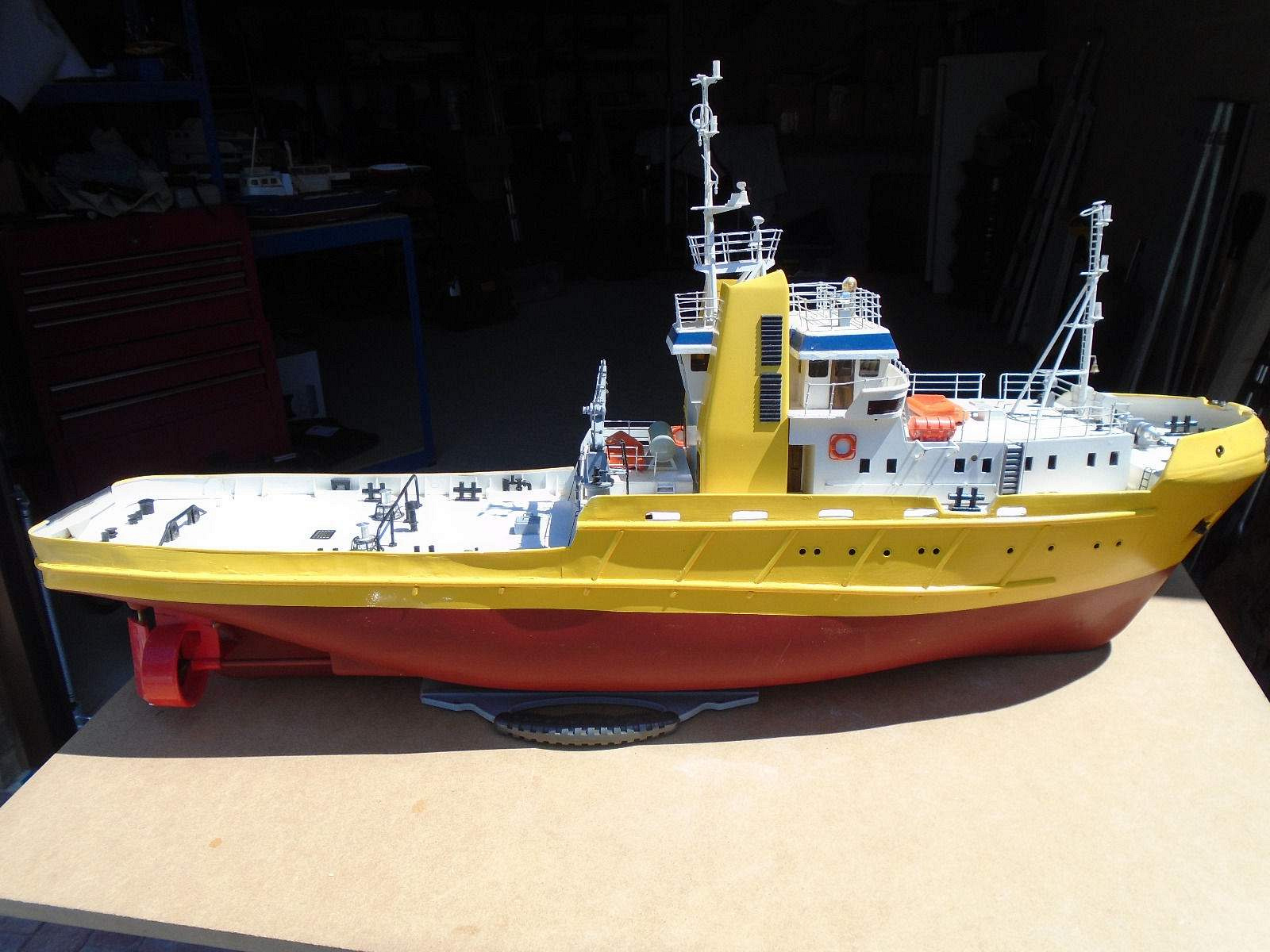 Found this kit on a well-known auction site and bought it for ยฃ100. it is the original Robbe kit and fittings included. There was no command module and so I have devised a way of having working anchors, tow, crane and warning beacon, bow thruster, nav lights and searchlight.