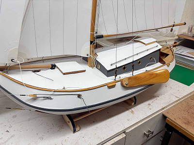 Another version of Katie - kept the hull, but changed the deckhouse, to allow fuller access internally. The mast is fully removeable for car transport, using pelican hooks on the shrouds. All blocks are handmade from mahogany with fully working brass sheaves. Capping rails are single piece for strength, steam bent. The deadeyes are not fully setup yet, hence untidy ropework, all other ropework properly spliced. The white rope lines are testing the best sheet routing prior to home making the sails from cotton poplin. Sheeting will be winch line for foresails and direct drum for main. The large slot internally between the winch lines is for a large battery, resting on the keel to add ballast. Taken about 9 months so far, and might finish over the winter, but not rushing.