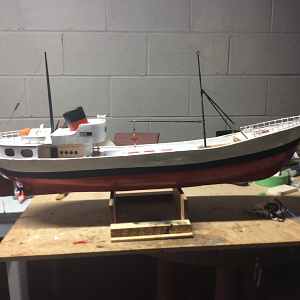 Model built in late 1950's by my uncle from scratch. Built of red cedar bread and butter. All fittings hand made. Originally radio controlled with a valve transmitter and reed receiver, see pictures, which I still have. I believe the radio only ever worked once as tuning the reeds was almost impossible, even for friendly friends at RAE Boscombe Down. Model was exhibited at the 6th International Boat Show, when the model stand was sponsored by Model Maker. Was awarded second prize and a pennant, see photo. The boat was given to me as a 21st birthday present, and a few years ago, I installed modern RC, and the model is now regularly seen at Chichester Canal Basin where it runs at scale speed, i.e. quite slowly.