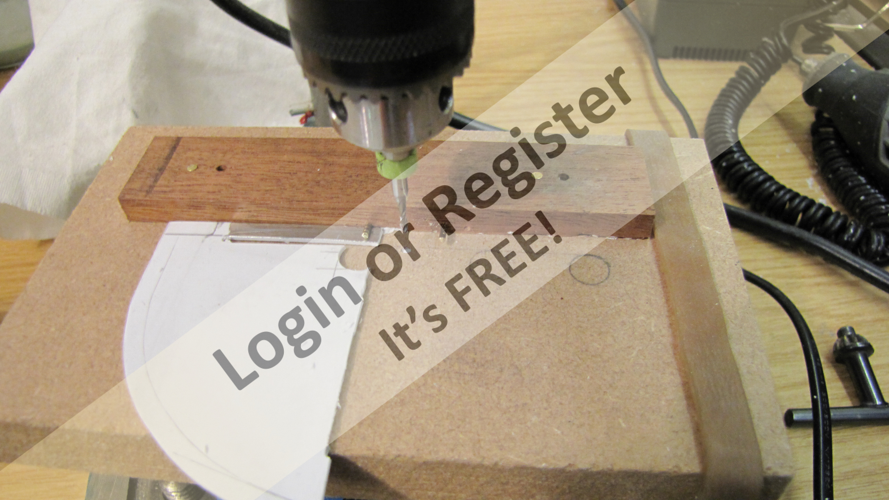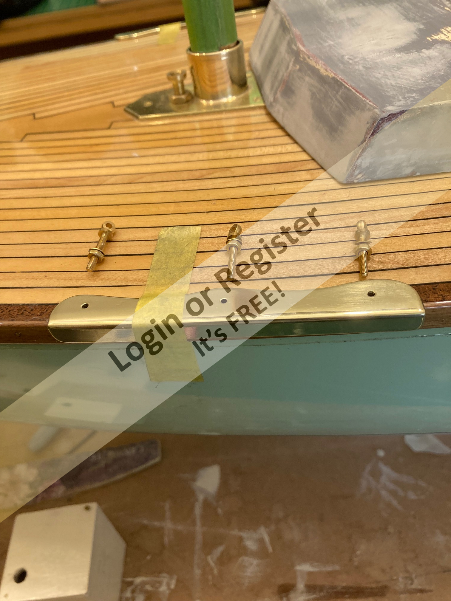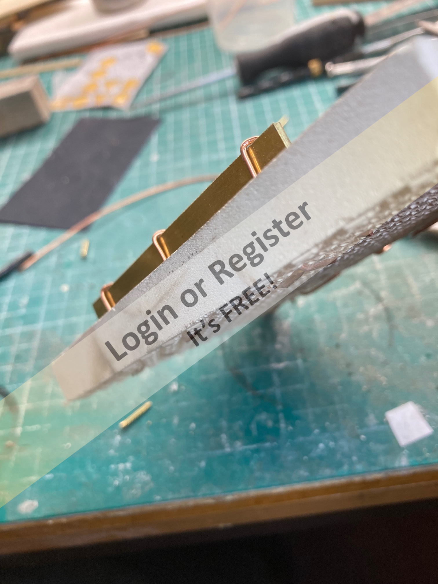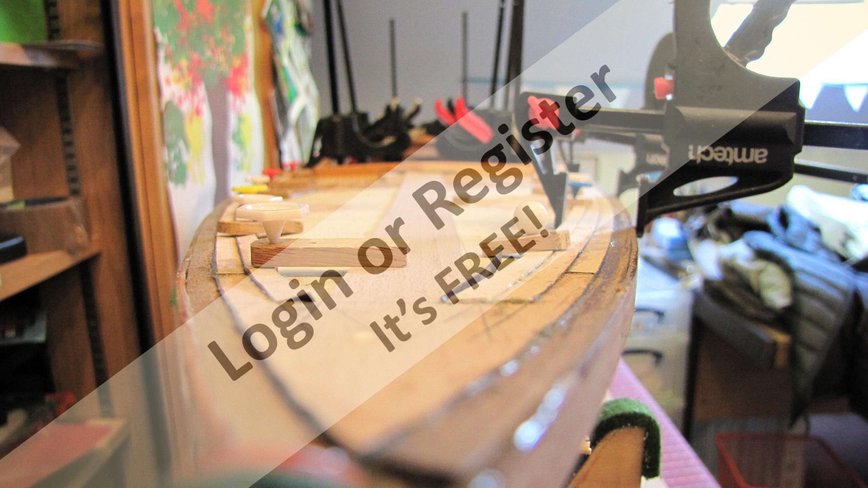 The backing ply is stuck to the building matt (which in turn is stuck to the building board) with double sided tape, this will stop the sheet warping when the glue is drying, it also allows me to fasten a piece of wood along the bottom edge to push each plank against and also to rest the angled โply pusherโ (see picture) against it to ensure each plank is at 45 degrees and is pushed up against the corking.