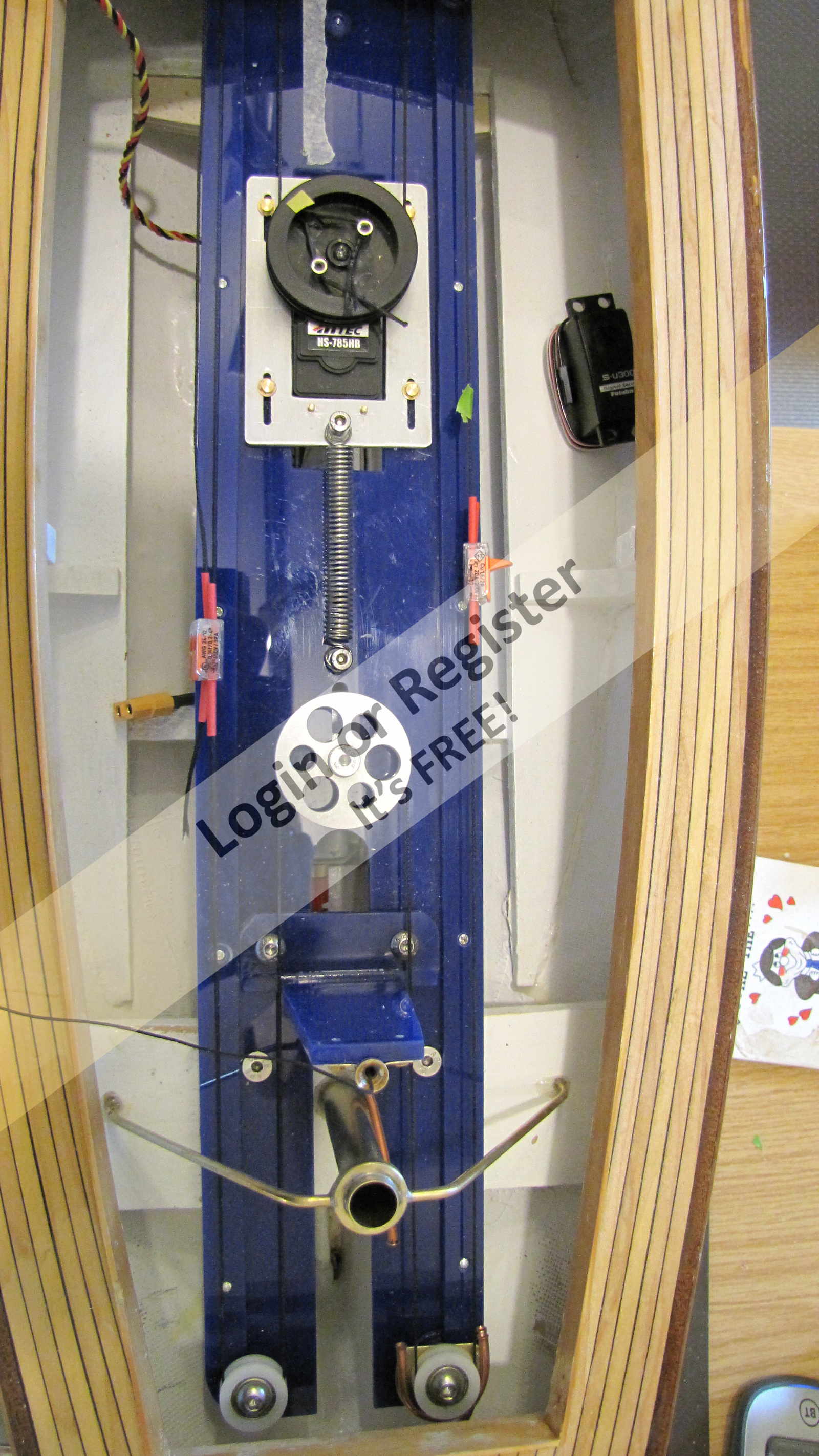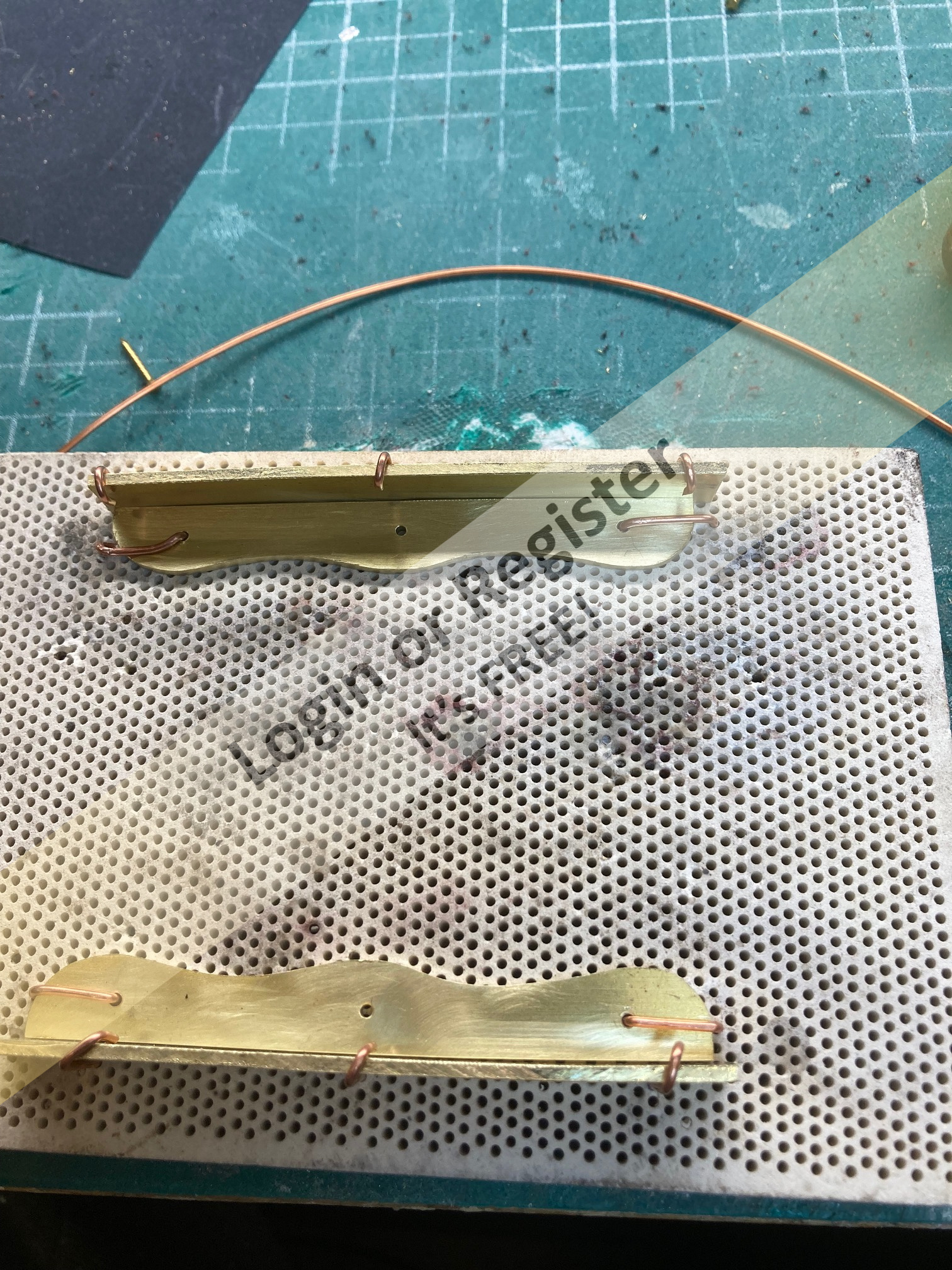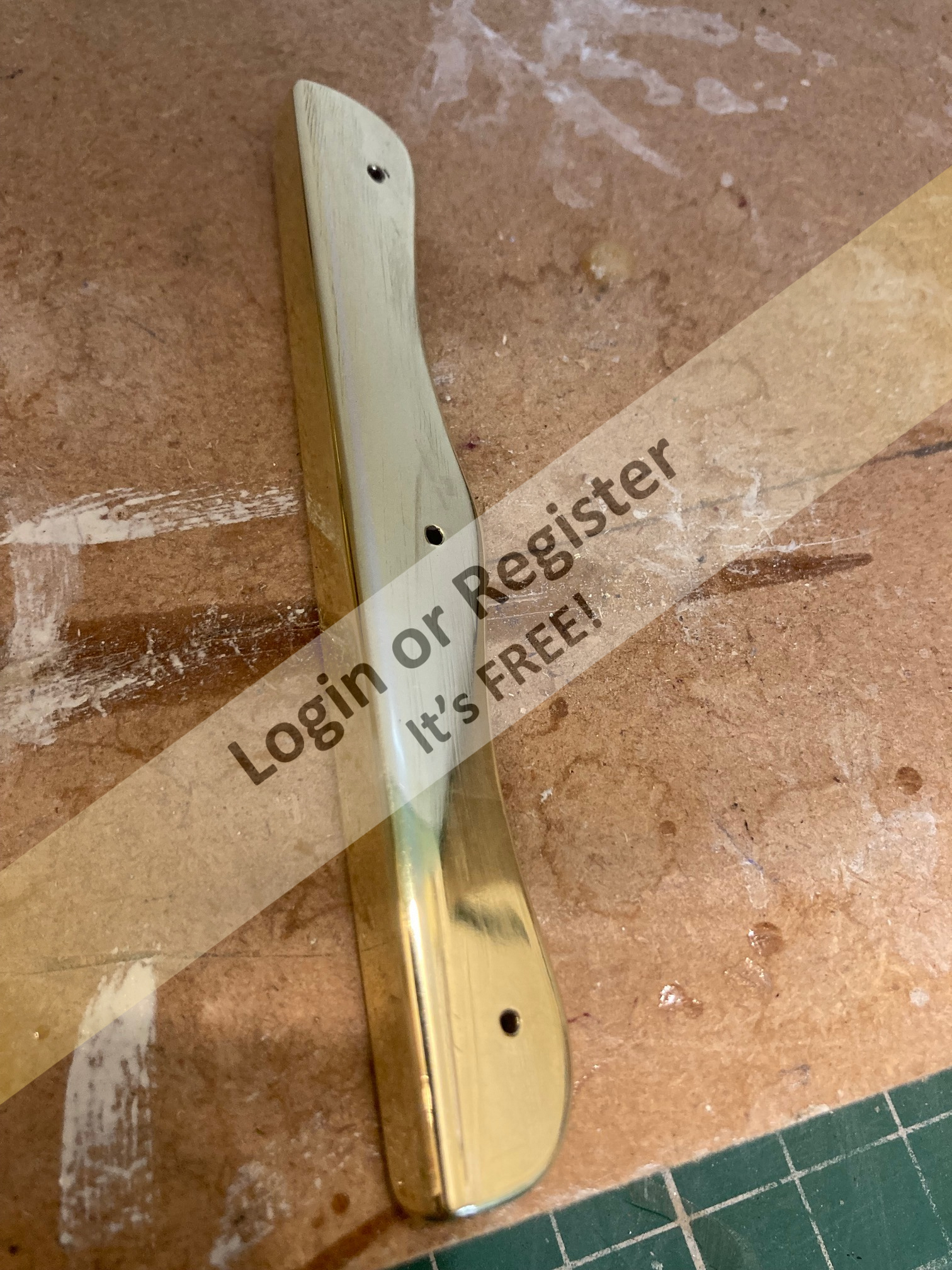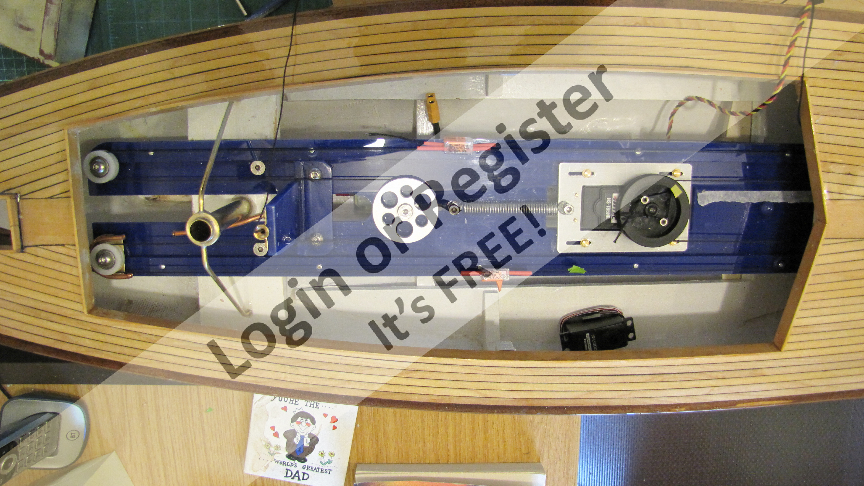 The backing ply is stuck to the building matt (which in turn is stuck to the building board) with double sided tape, this will stop the sheet warping when the glue is drying, it also allows me to fasten a piece of wood along the bottom edge to push each plank against and also to rest the angled โply pusherโ (see picture) against it to ensure each plank is at 45 degrees and is pushed up against the corking.