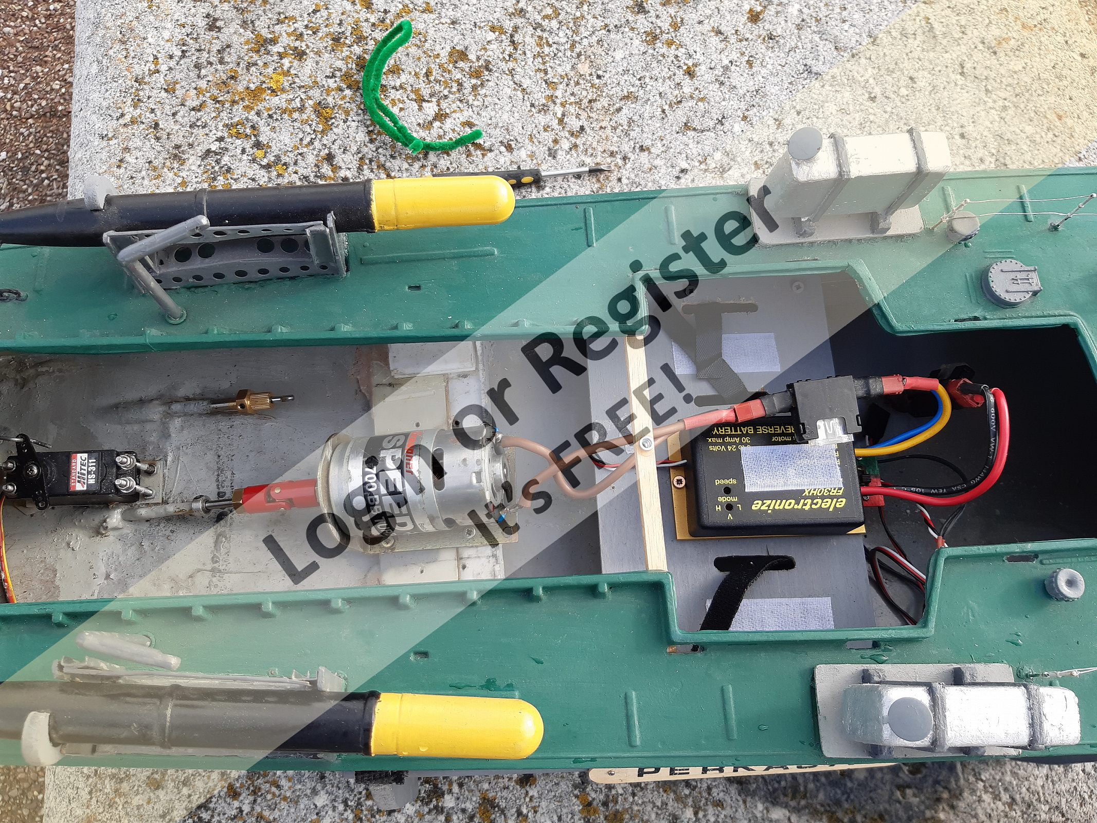 tried to sell this some months back, no interest, so I decided to do some improvements, to make it perform better, and easier to use. I removed the triple screw set up, and replaced with a single motor. To make things as easy as possible to use, I have installed a Graupner 700bb brushed motor. You can use any battery chemistry with this, and it offers a wide voltage range. I have also removed the scale rudders in favour of slim ones. As its gone from triple to single screw, the prop wash isn't over the rudders now, so there is possible improvements to be had, I just used what I had to hand.