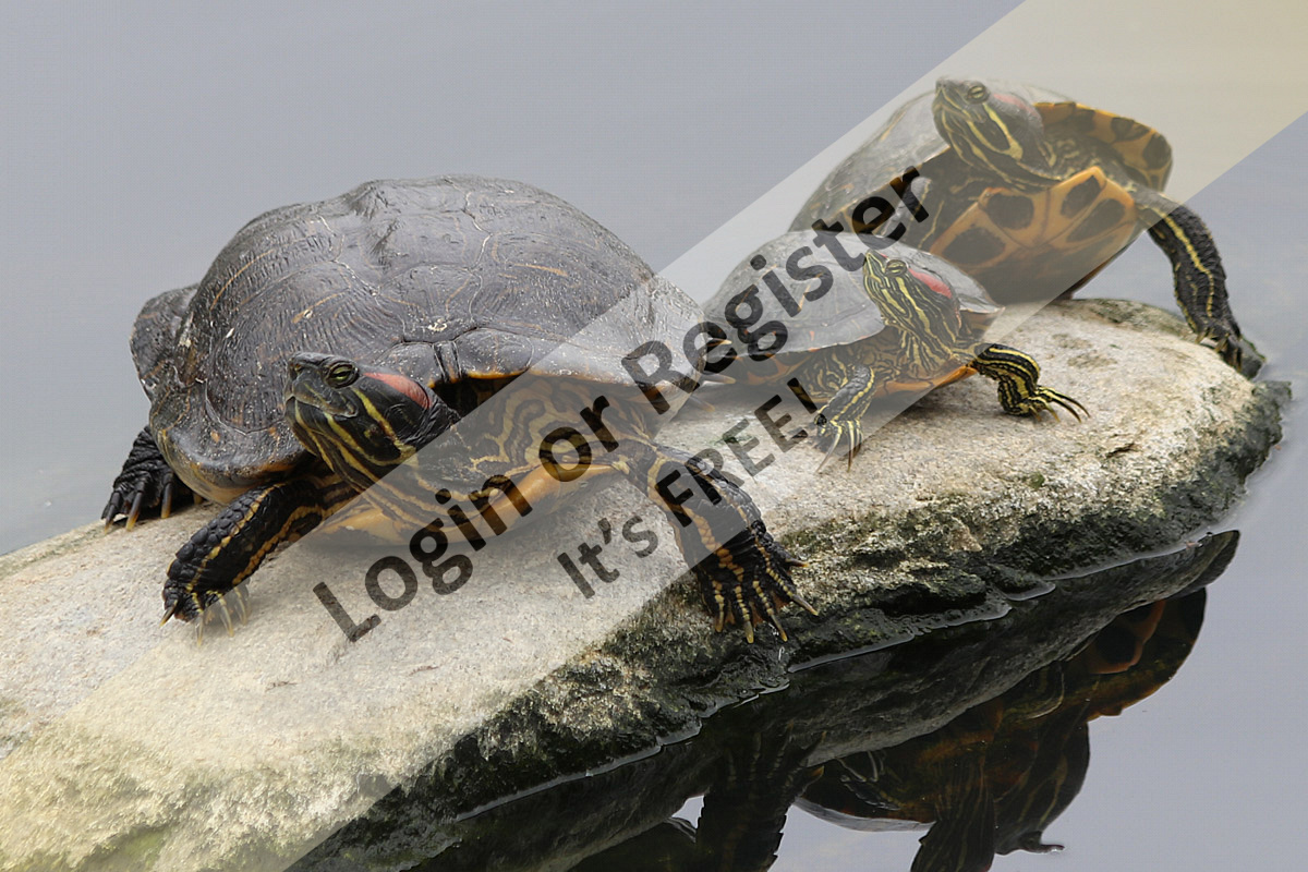 Three turtles looking over their shoulders at an RC schooner sailing a bit too near. Photographed on Sunday, March 30th, 2025 at William Mason Regional Park, Irvine, California, USA.