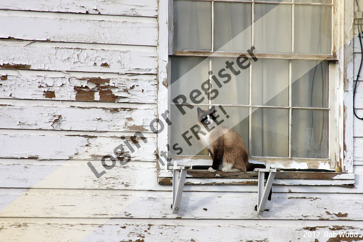 Cat on a hot, wood windowsill. Abandoned US Air Force base in Wendover, Utah, USA