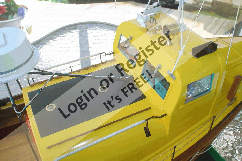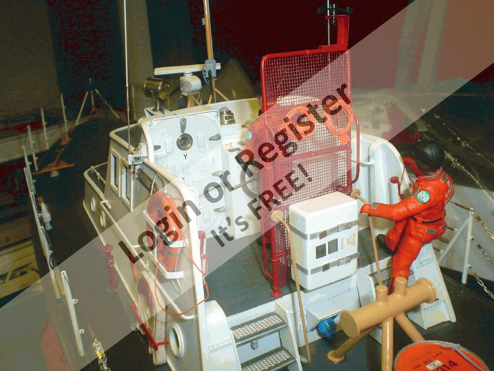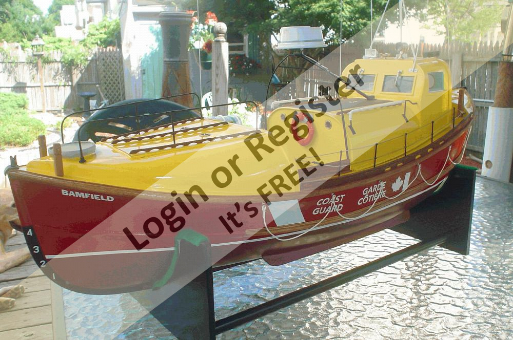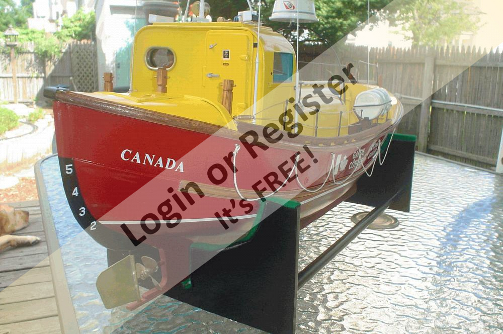 It's powered by a Pittman 12 volt motor and controlled by a 4 channel radio. Working features are running and spot light, siren with flashing blue light, sweeping radar antenna and deck lights. Built in 1985 the model the lifeboat is accurate in appearence for that time period.(The prototype has been modified since).