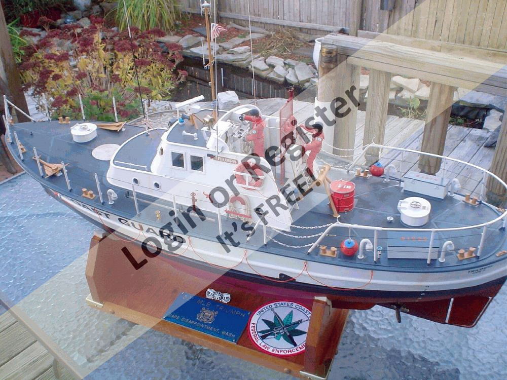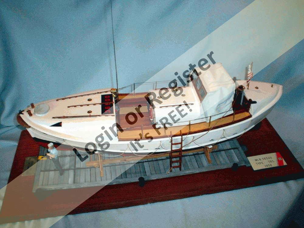 This model was scratch built from US Coast Guard plans. The boat is constructed of balsa wood and the hull coated with fiberglass resin. All the deck gear is scratchbuilt from brass, the propellers, led's and figures are the only commercial parts. Scaled at 3/4=1 foot the model measures 42 inches in length.