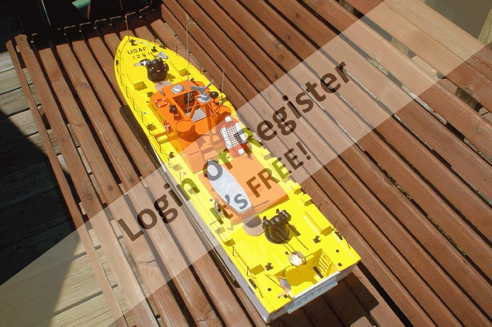 The model was given to me to be restored(top picture) for the son of a retired USAF veteran that was a crash boat crewman. The model was built in 1957 and had been run a few times on a tether line, R/C was pretty expensive back in the day. I stripped the hull, filled in all the cracks and rebuilt the mast. I added a small boat, davit, liferaft, coxswain station, spray shield and deck hardware among other things. Actually all the owner wanted was a paint job, he was very happy with it's new appearencep! Although I fiberglassed the wooden hull and made it watertight, the owner doesn't plan to run it, just a memorial to his dad's service. I really enjoyed working on this "rare bird".