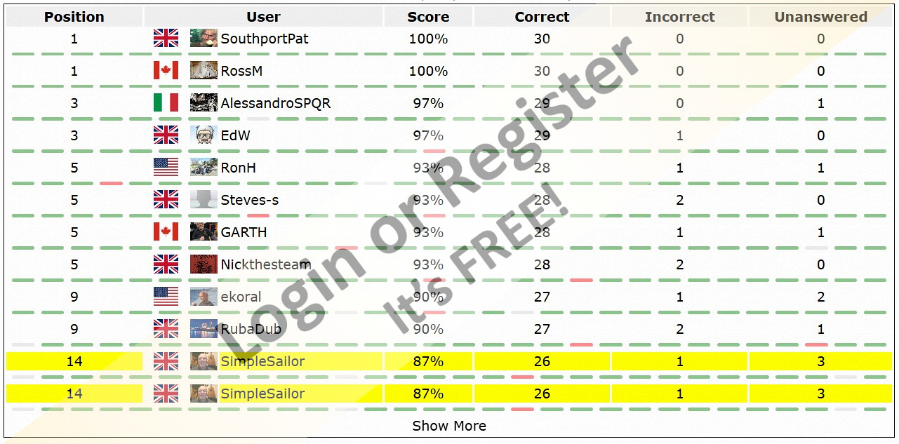 Thanks EDW for the question on the 17th. I might have missed it as it doesn't ring a bell, but I do know what a "Throat Halyard" is used for on a gaff rig. I would have gone for B