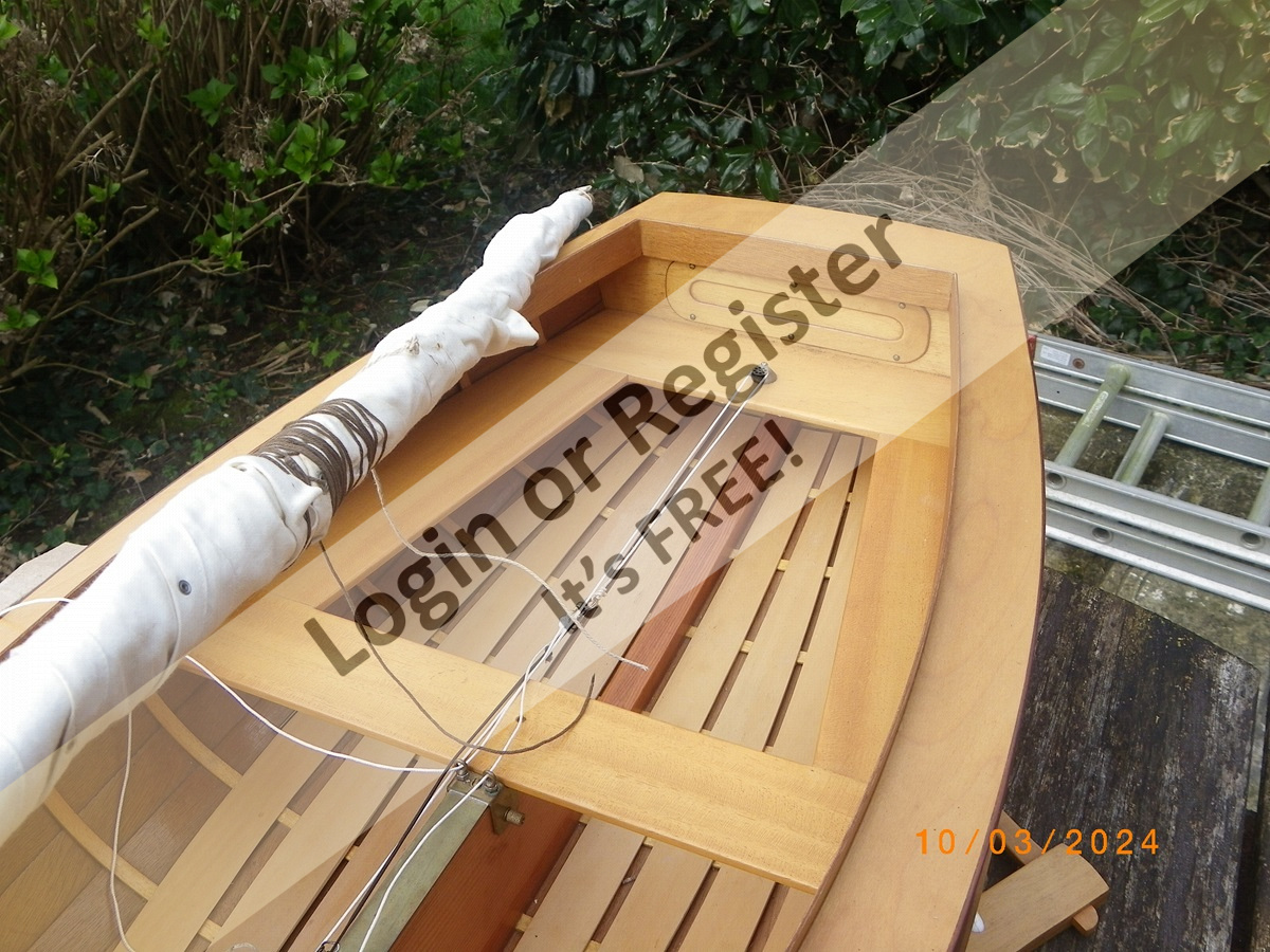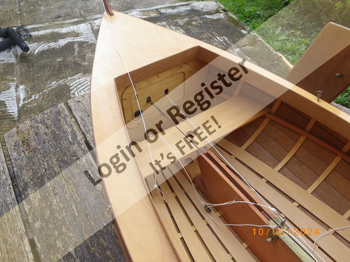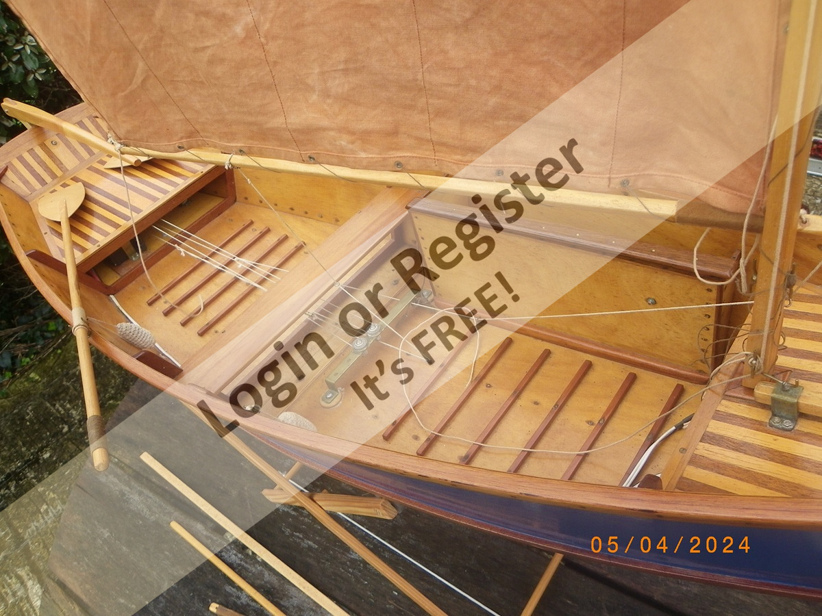 1:4 scale Optimist, built 20 years ago to Optimist Association plans, the idea was to be a dual role model, for exact scale static competitions and also for r/c free sailing. The r/c setup being demountable with replacement by a scale forward seat/bench -- never happened!