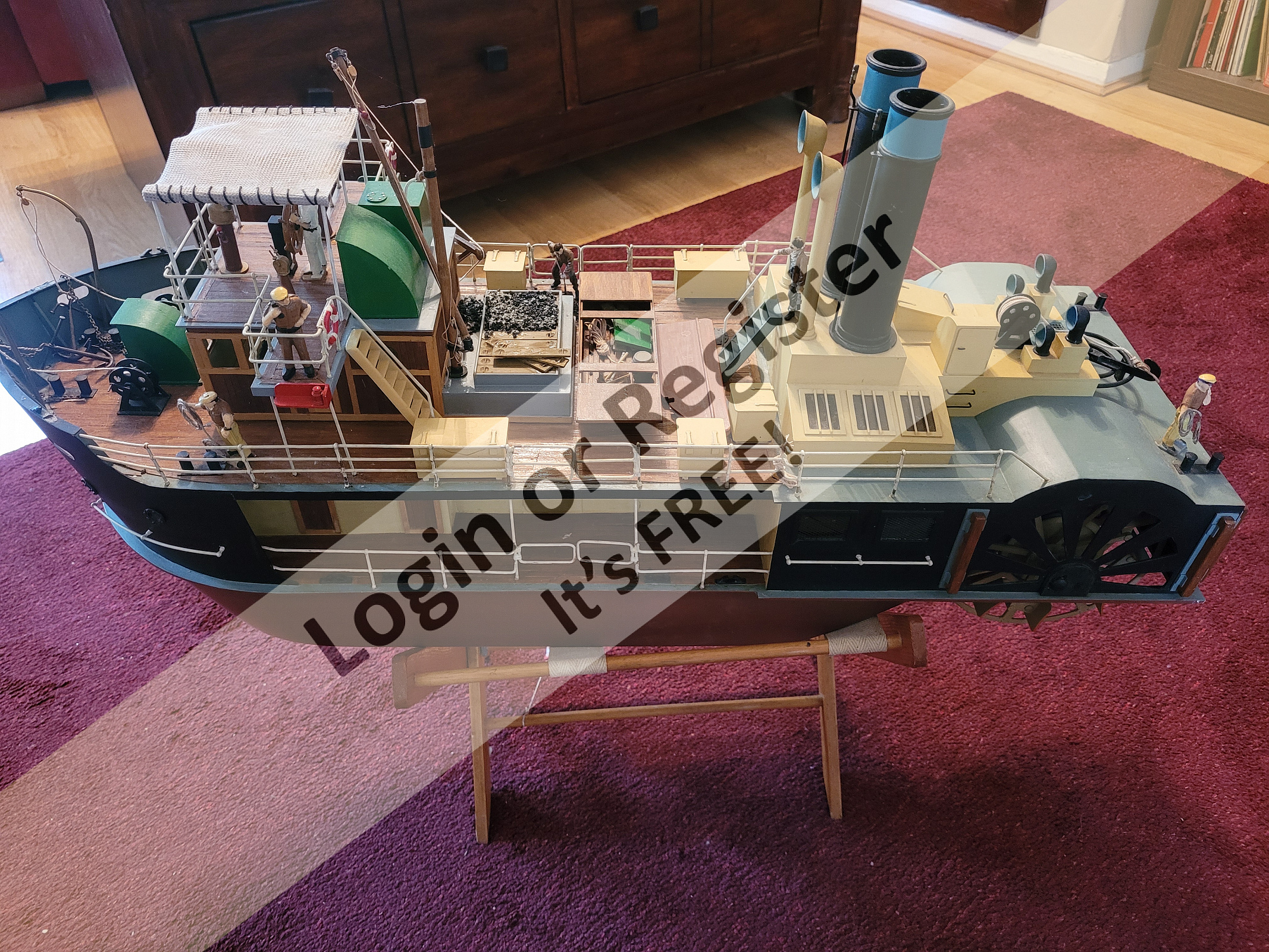 Lulonga steam river tug. Broad beam twin stern paddles. Very stable and graceful on the water. Single motor (12 volt)chain driven from geared motor. Fitted with smoke mister, lights and sound. Unusual model built from plan. Lovely to sail on a summer evening.