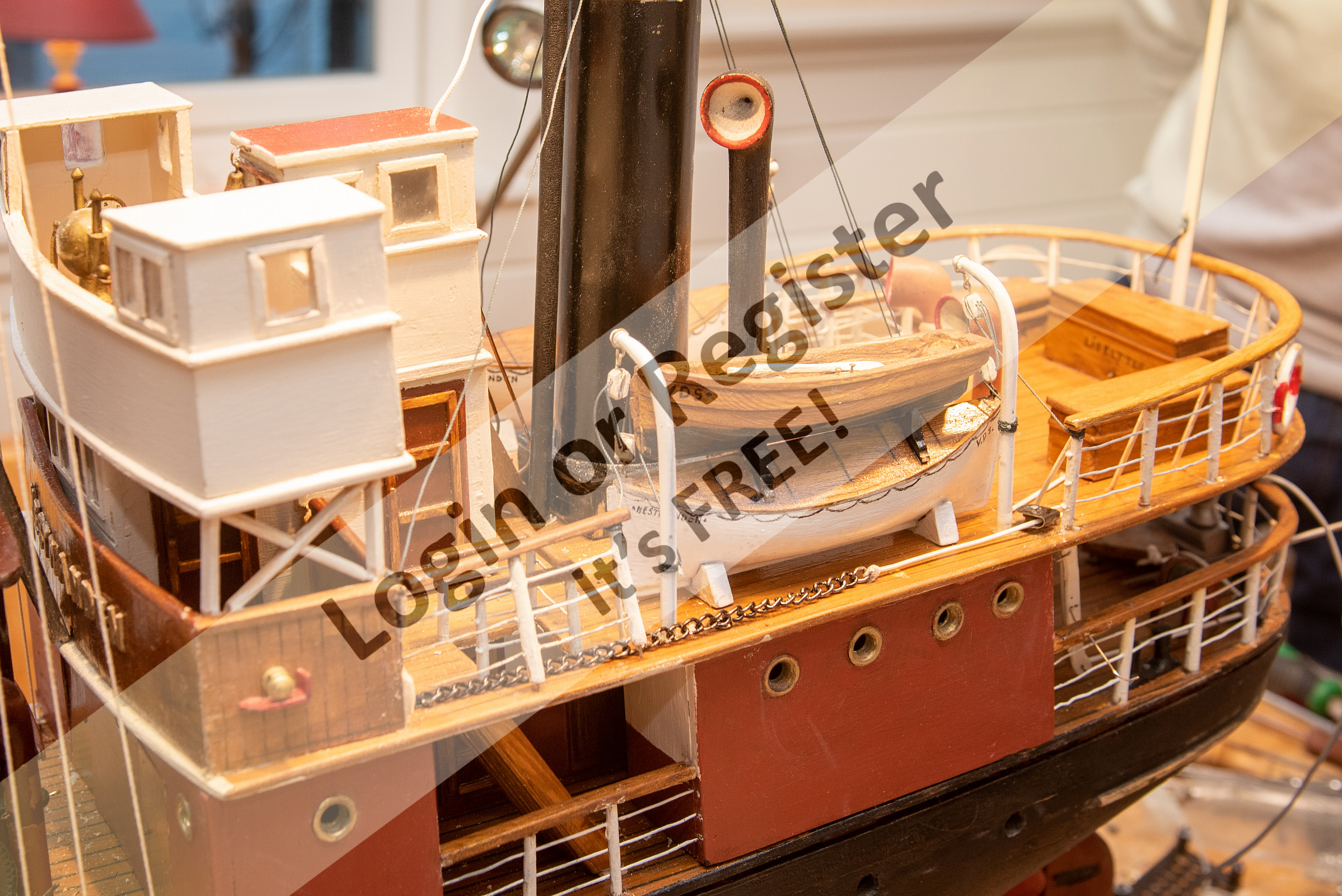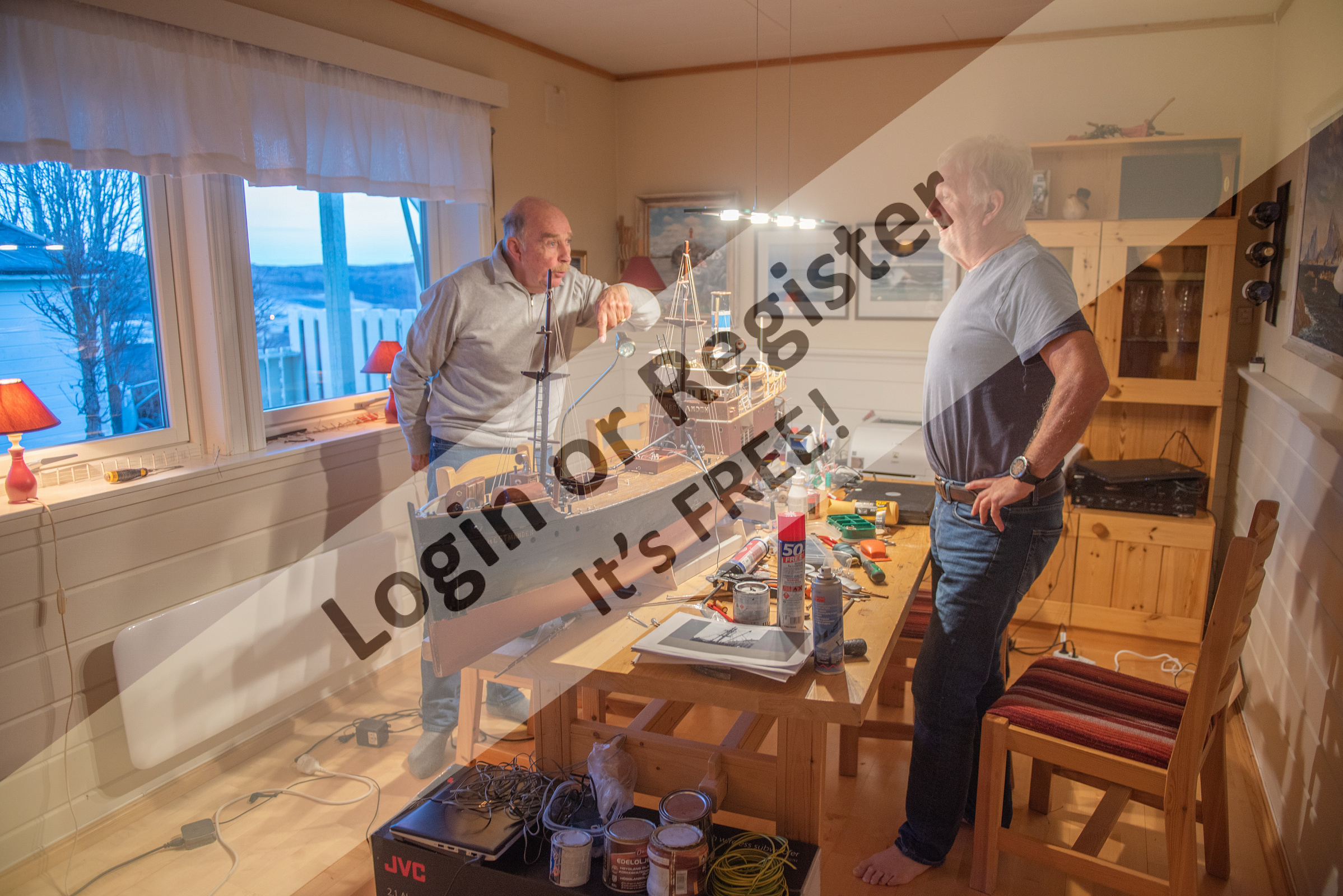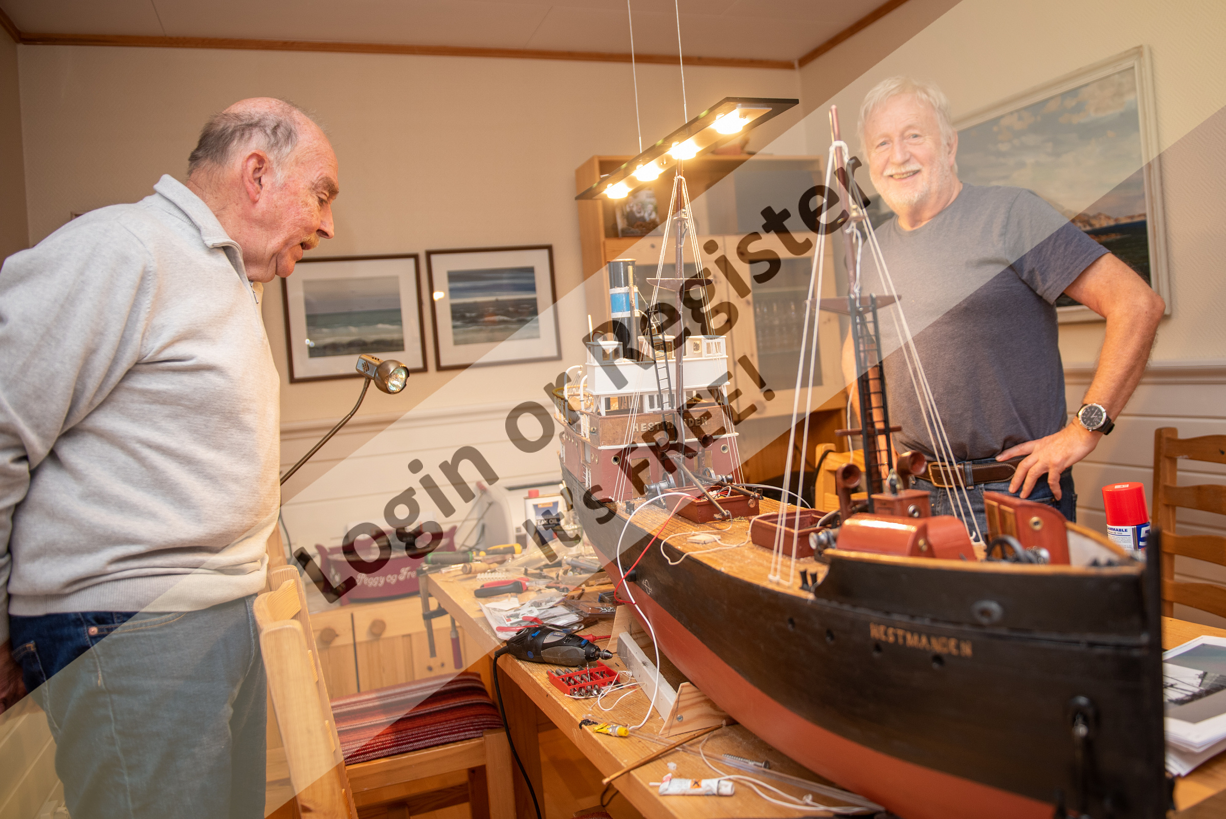 In the photos, the father of Torbjรธrn, the man to the left, built the ship model. It originally had a wind-up motor! Freddy (right) is now restoring the model. It is in original colours, but the restored original ship is in military grey.